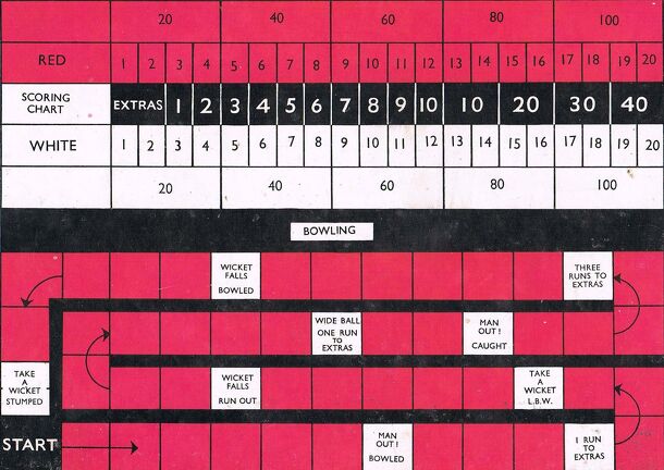 Game found in The New Book of Games, circa 1950. Two boards are provided, one for the batting side and one for the bowling side. Opening batsmen, before beginning play, are allotted a colour, either red or white. When a batsman is out, the next batsman in takes the colour just vacated. One counter is used for batting and one for bowling. These are placed...