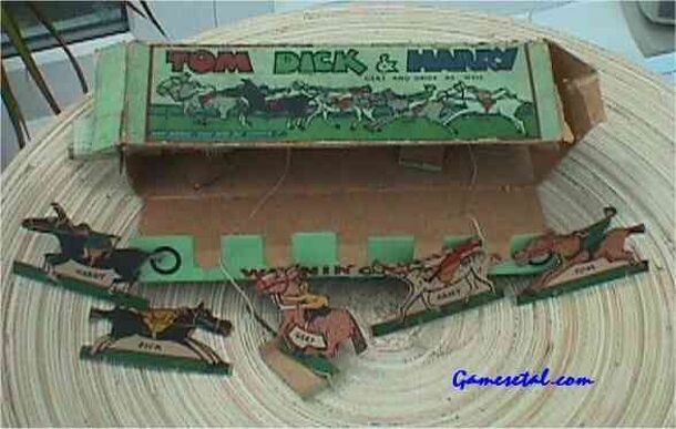 A very cheap version but with the same idea as Jaques’ Ascot. The game consists of a box that houses five card horses and riders: Tom, Dick and Harry – Gert and Daisy as well. The horses are attached to a spindle by cord that winds around the spindle when turned. The horses are set up on the table, the handle turned, and the horses approach the winning...