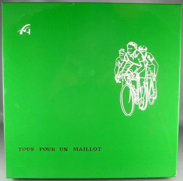 French cycling boardgame that appeared in the '80s or early '90s. The green gameboard has France on it with a road that represents the Tour de France. The game has wonderful metal cyclists that in 4 different colors, each for a player. There also is a cyclist with a yellow jersey to represent the leader and a rider with a blue cap to represent the leader...