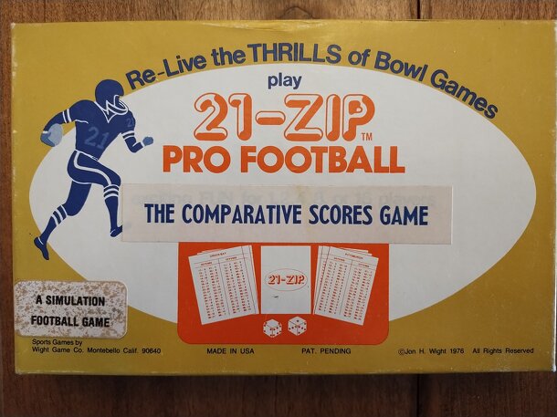 Statistical American Football game. Incredibly fast to play, it just uses one or two dice rolls to produce a result. This fast method means that a whole season - every game - can be played in one evening. Each team has a specific rating based on the statistical data for that season. These are compared in a match-up and the dice does the rest. Originally...