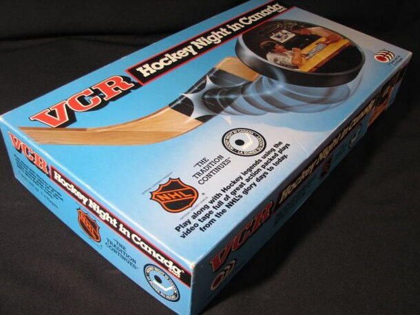 This game is played until one team scores a number of goals agreed to before the game. Play is controlled through cards, moving the puck and allowing shots, which are resolved through dice rolls. However, when a "VCR" card is drawn from the deck, a videotape is consulted which can result in an opportunity to try for a goal by flicking it from a spot on the...