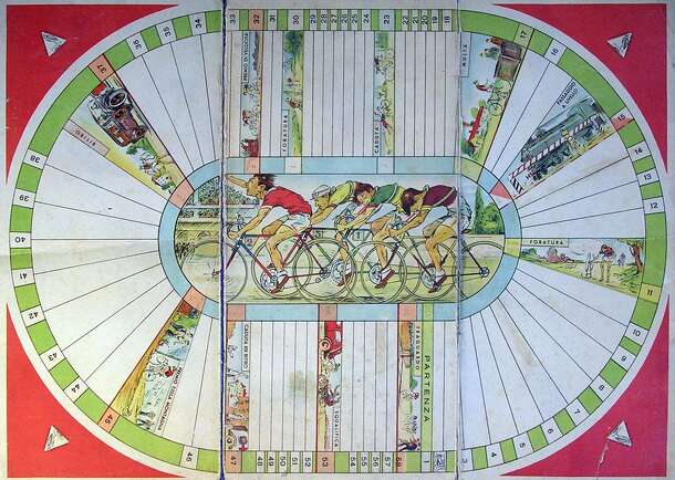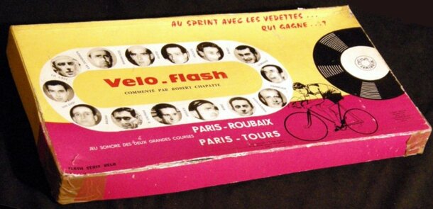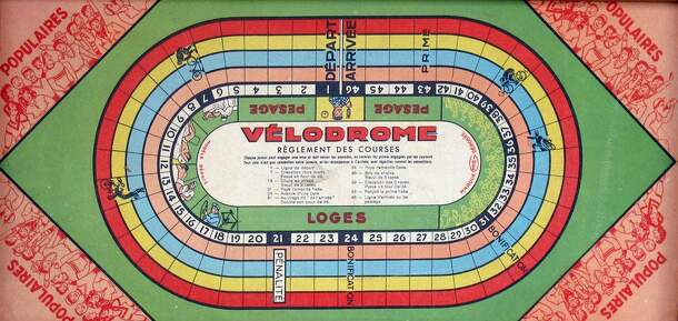 French vintage cycling game published in the '50s. It is about 2 famous classic cycling races: Paris-Roubaix and Paris-Tours. The game consists of two parts. The first part is played on the green part of the board, and it is a dice game. The sprint of the race is played on the velodrome (blue) part of the board and uses the aleatory record. An aleatory...