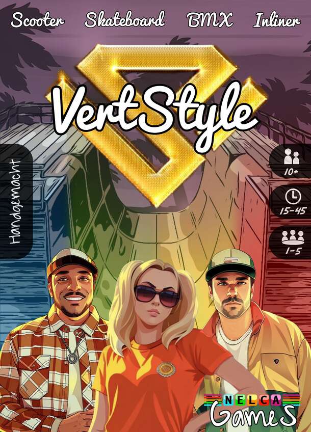 Objective: Master the ramp and showcase your extreme sports skills to become the VertStyle champion. Setup: Each player chooses a color and takes the corresponding game pieces: a character card, six trick chips, and a scoring pad. Set up the common game area with the ramp and scoring zone. Game Play: Players take turns performing tricks on the ramp. Use...
