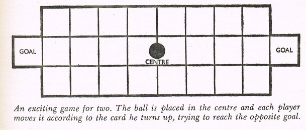 This game was in The Children's Book of Games, Puzzles and Pastimes. The rules: This is an exciting game played with one pack of cards and a piece of paper with the “pitch” as shown. You can use a coin, counter or button for the ball. Place the ball in the centre and the pack face downwards at the side of the table. One player begins by turning the top...