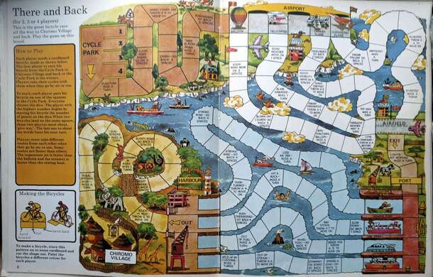 Strange cycling board game because during the race the cyclists also switch to air movement (via either a balloon, slow or fast air plane) and travel over water (via a rowing boat, 2 normal boats and a hovercraft) between the tracks. The cyclist who arrives first in the port can choose which boat he chooses and thus move faster over the water to the final...