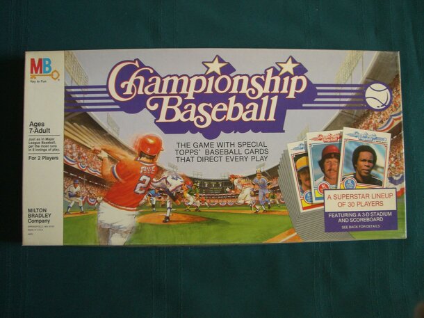 This 1984 game from Milton Bradley features special TOPPS baseball cards. Those cards direct all of the action of the game. The backs of the cards feature statistically accurate batting records that have been computer analyzed into dice roll combinations. The game features stars like Pete Rose, Rod Carew, Reggie Jackson, George Brett, Mike Schmidt and 25...