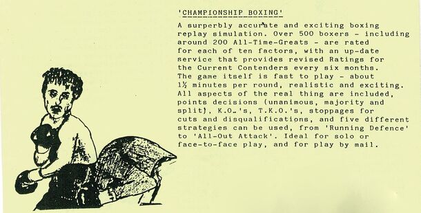 From the Publishers website: Championship Boxing is intended to be a realistic simulation of top-class boxing producing accurate results and incorporating all the relevant factors such as boxing skill, punching power, stamina etc. Considerable thought has been given to a system of play that captures some of the 'feel' of boxing, while still playing...