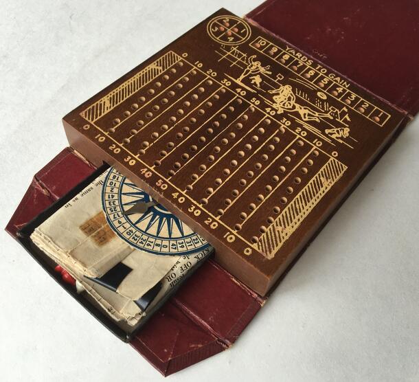 This pocket-size wartime football game consists of a block of wood less than 5" a side that is wrapped in simulated leather. Included in a cardboard drawer in theblock are an unusual 48-space spinner, four wooden pegs and a rules sheet with results table. The board has 100 holes on the field punched diagonally between each printed 10-yard division on the...