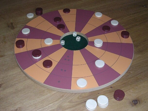 Barsaman is a backgammon like game on a circular board. Using three dice each player tries to bear off his pieces using standard, double and triple moves. The dice determine in which ring on the board you are allowed to play. Along the way the opponent's pieces can be blocked or captured. Captured pieces help you finish the game early. Player with the most...