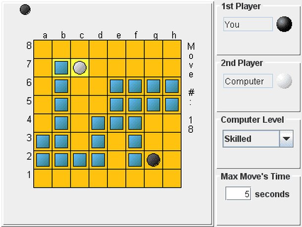 This game is played on an empty NxN square board (such as a 7x7 board). Each player drops his stone on an empty cell. On each turn, each player must move his stone. The stone moves similar to a chess Knight, but in two steps rather than one. First it moves one (two) cell(s) in one direction, then two (one) cell(s) orthogonally (hence each player has two...