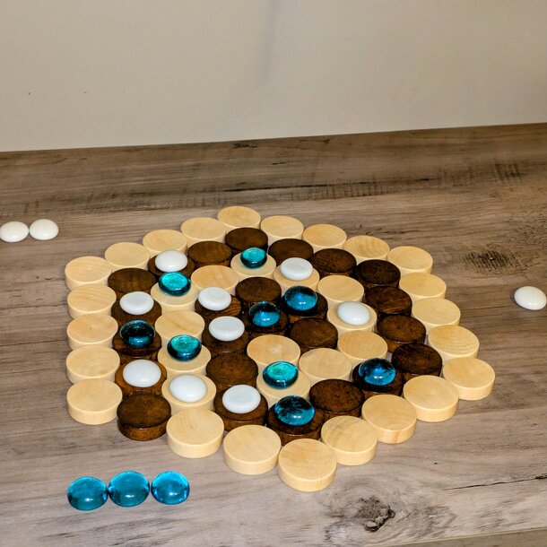 Besont is a two player placement game based on the nim principle where players place generic pieces ('gold coins') on the board. Taking turns players lay 1 - 5 coins along any straight line, they don't even have to be connected. The winner is the one who lays the last coin on the board, the 15th coin. It's not about making lines, it's about setting traps....