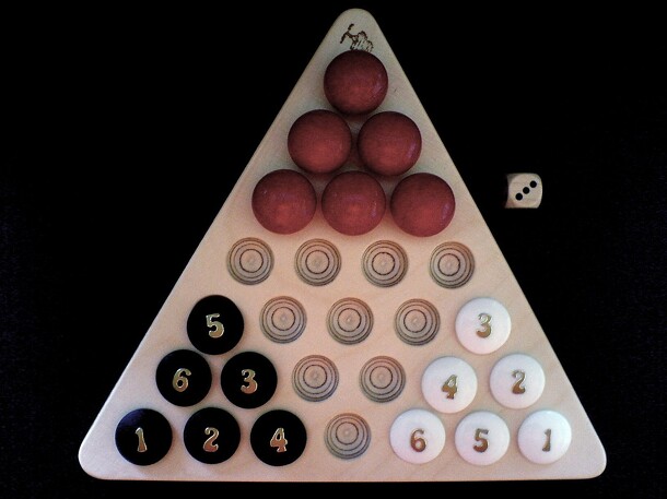 BigBalls represents an advanced development of EinStein würfelt nicht! and consists of similarly short rules. The neutral balls however do not allow to use the same successful strategies as in EinStein würfelt nicht!. The wooden gameboard is triangular with 28 fields. Each player gets a color (black or white) with six stones each. In addition there are six...