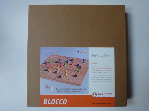 Blocco is a dice game with strategic elements for 2-4 players. On your turn you roll two dice and chose the result from one dice and move one of your pawns accordingly over the board. Then you put a block ("Blocco") on the field from where you started. Nobody can go back to that field anymore or jump over it. Therefore, the board gets smaller and smaller....