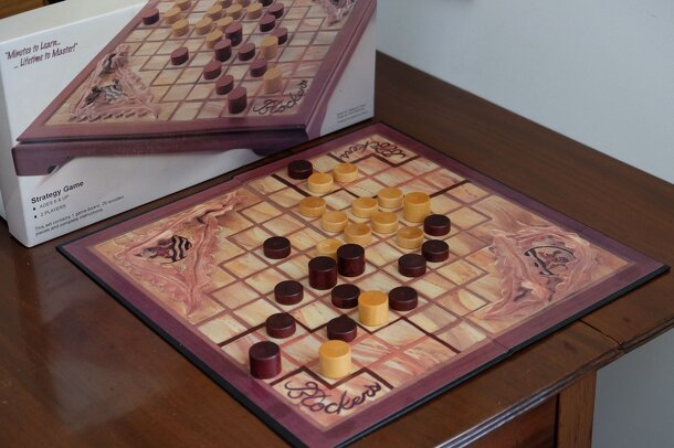 Blockers is a two-player variant of Chinese Checkers, as players race to move all their pieces from the starting location across the board to their home spaces (that is, the spaces originally occupied by their opponent). The game is played corner to corner on a 10x10 board, with 15 spaces of each neutral corner not in play, resulting in a 70 space playing...