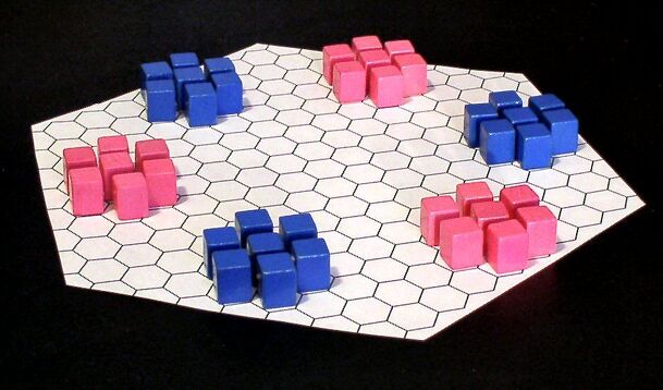 The game is played on a 8 sided hexagonal board, with groups of 7 stones, arranged in a hexagonal formation, at the center of each side, with opposing colors facing each other (a diagram is available on the game's website.) On each turn, a player: (a) selects a group of connected friendly stones, (b) name one as pivot, and (c) rotate the group any multiple...
