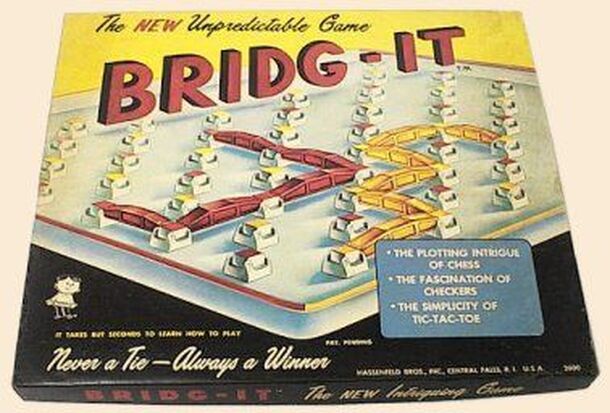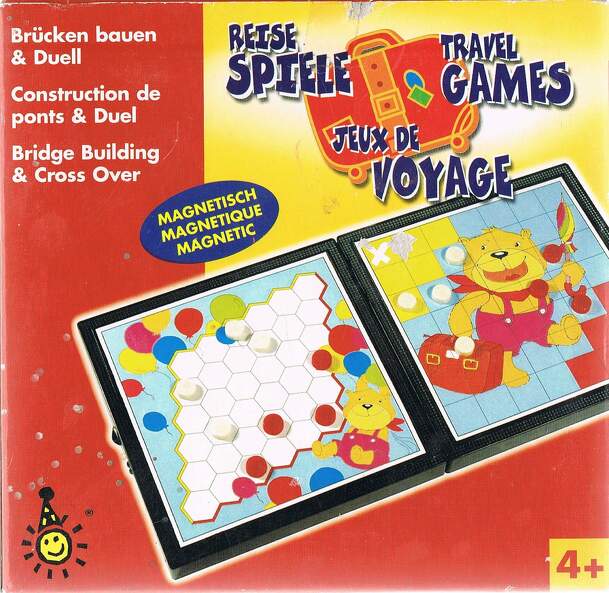 Players attempt to place a continuous connected path of bridges from one side of the board to the opposite side while blocking their opponent from doing the same. Contents: Plastic mold board with raised nubs to place the bridges on 40 bridges (20 Red, 20 Yellow) The rules include an advanced version in which the number of bridges allowed is decreased...