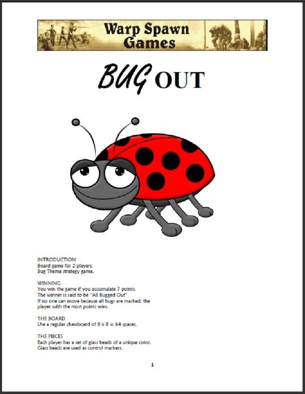 A strategy game with a bug theme. The game is played on an 8x8 grid or chessboard. Twenty-eight Bug counters are placed on all of the squares around the edges of the board. There are four each of seven types of Bugs: Bee, Ant, Ladybug, Grass Hopper, Beetle, Spider, and Dragon Fly. Each type of Bug moves differently. The players take turns moving...
