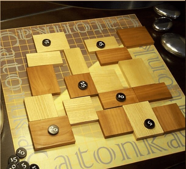Catonka is a combination of a tile placement and capturing game. First, players place rectangles and squares of different size on the board and place their armies with different strength on them. After all fields and armies are placed, the capturing begins. An army can only move on an adjacent filed with a weaker unit on it, which than is captured. After...