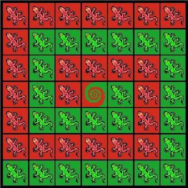 Chameleons is played on a 7x7 square board. The board is occupied by Chameleons except the middle cell. Each player starts with 24 Chameleons on his color. A Chameleon may move to any adjacent empty cell. A Chameleon that remains on a different color for more than one round will change itself to match that color. The central cell is always considered to be...