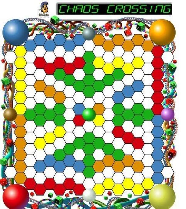 Description from game pdf Chaos Crossing is a game for 2 to 4 players. This game requires Pegable Pawns: 4 blue, 4 red, 4 orange, 4 yellow, 1 green, 1 grey, 1 white, 1 brown, 1 purple; 1 game board; 1 six sided die. The object of the game is to send all of your pawns out onto the board to collect crowns and be the first to return all of your pawns...