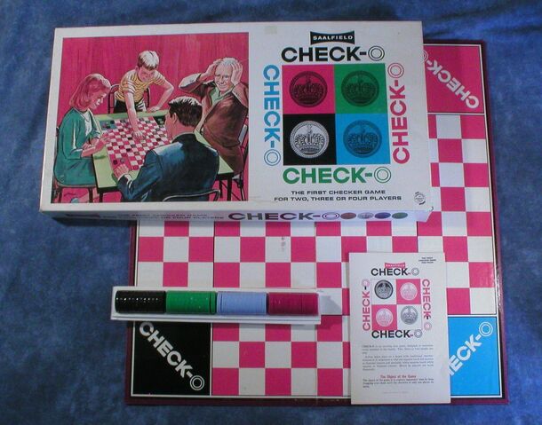 From the Instruction folder: "CHECK-O is an exciting new game, designed to entertain every member of the family. Two, three or four people can play." "Action takes place on a board with traditional checker-squares on it, separated so that red squares touch red squares at diagonal corners and similarly, white squares touch white squares at diagonal corners....