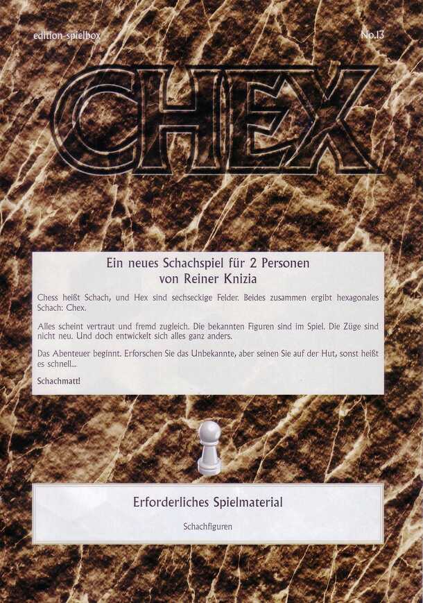 The 32 pieces in Chex represent the 16 chess pieces on each side of a normal chess game. Each player shuffles his own 16 tiles and places them face down, then white draws his top tile and places it, with the piece oriented so it looks upright to him. Black then draws the top tile in his pile and places it so that it touches white's piece, either...