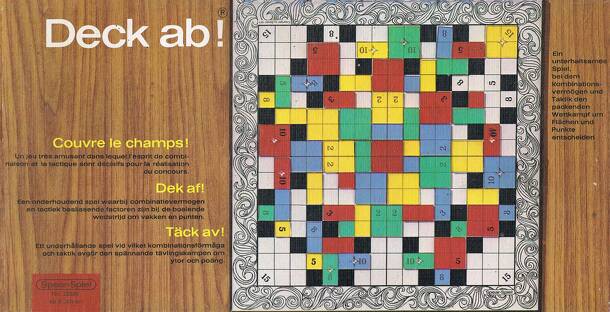 From the box: "Cover-Up is a game for the entire family. The idea is for each player to cover up as many squares and gain as many points as possible using the tiles provided for each player. However each tile played must touch another tile and cannot cover a black square. Each player must be careful not to give the easy plays to other players or not to...