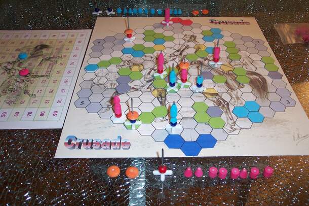Fairly abstract, ligthly themed game on Crusades. Basically each player has a fixed number of crusaders (pieces with variable strength - defined by the players using force points and speed points). With these crusaders the players will try to gather as many victory points as possible through: - battles - fight other crusaders and take their points off...