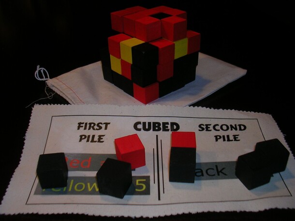 Cubeo is a fast-paced abstract dice game for two players, where no die is rolled. Although this game is referred to as a board game, no board is needed--a flat surface suffices--and a set of twelve 6-sided dice in two colors, six for each player. The main objective of both players is to put dice on the surface, creating a single 2D formation from them, and...