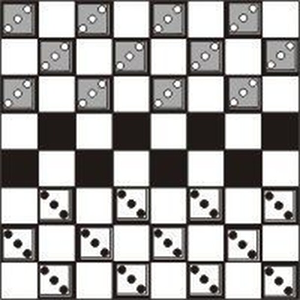 The base idea of the game is to cross the rules and the draughtboard [checkerboard] with the use of dice instead of pieces. In fact to play Dadama you need 12 dice per player and a 8 x 8 draughtboard. (Dadama is a synthesis of the Italian words “dado” = dice and “dama” = draughts/checkers – translator’s note.) This game appeared in issue 17 of GiocAreA...