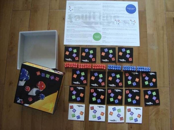 Dados is a dice game for 2-4 players. Each player gets 36 dice, which are rolled 4 at a time and placed on 18 tiles. Each turn, a player can choose to either roll the dice, placing one die on four separate tiles, or to pick up one contested tile where he/she the higher total pip count, earning points based on what is written on the bottom of the coaster...