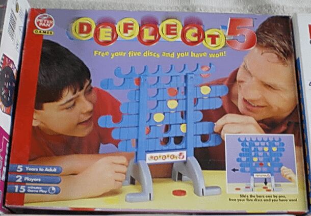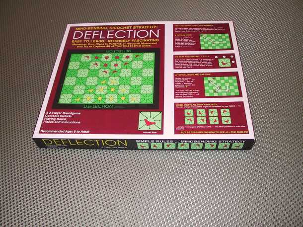 Deflection - an abstract game in which players drop colored counters into a rack made of sliding strips. The counters drop through slits in the rack and the players take turns to move the strips back and forth, trying to get their tokens to fall into the highest scoring sections of the bottom tray, while at the same time blocking their opponent or forcing...