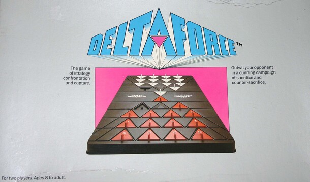 DELTA FORCE - "The Game of Strategy, Confrontation and Capture. Outwit your opponent in a cunning campaign of sacrifice and counter-sacrifice." Each player has fourteen triangular pieces numbered from 1 to 14. These are arranged in a matrix on each player's side of board. Once placed the counters are moved forward towards the center of the board where...