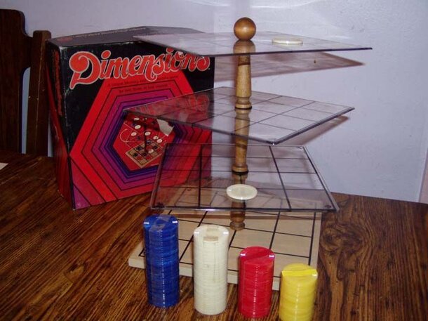 Dimensions is a three-dimensional tic-tac-toe variant, but a somewhat unusual one. The play area consists of four 4x4 stacked boards. On a turn a player generally places a chip on an empty square, but instead a player can choose to rotate one of the top three boards by a quarter-turn. Players score points any time three or four of their pieces form a line...