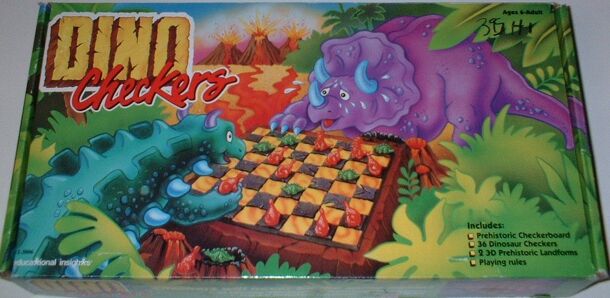Played as the classic Checkers except there are only 7 pieces per player (dinosaurs). There are two variations on game rules depending on age of the players allowing movement forward and backwards with or without kinging first. The winner is the first to capture all the opponents pieces or force the opponent in a situation where they cannot move a piece....