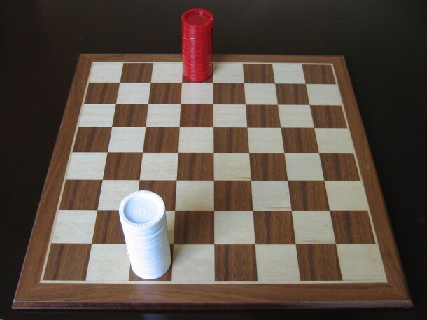 Dipole, played with a Checkers set, begins with two stacks of checkers: a stack of 12 white checkers in White's nearest row, and likewise for Black. A stack, or a portion of a stack, is moved a distance equal to the number of checkers in the moved stack. So a three-stack, for example, can be moved a distance of three squares. Non-capturing moves must be...