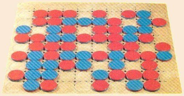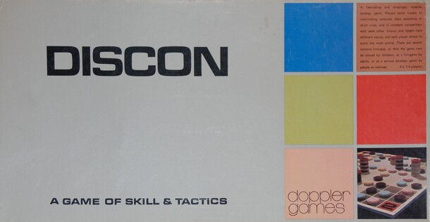 Discon is an abstract game for 2-4 players. A 10x10 grid is covered with stackable discs in four different colours, save for the corners, which are numbered and act as the players' starting positions. Each player has 6 "roof" discs which enter the board in their corner. Roofs move in an L-shape, like a knight in chess, and collect the discs in the squares...