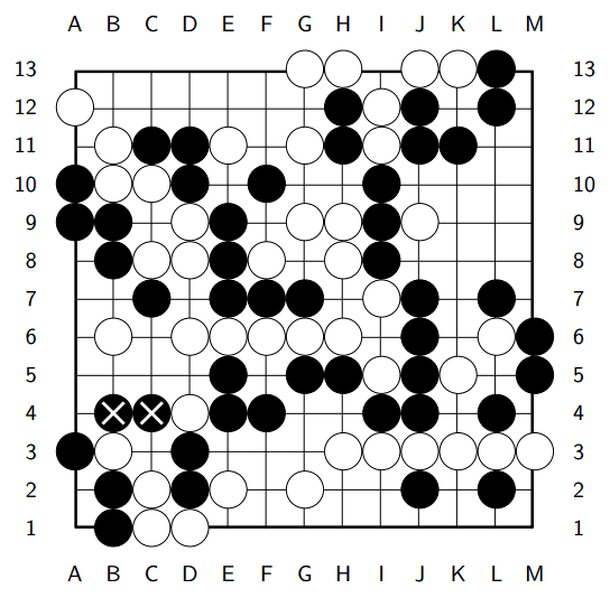 The game is played on a 13x13 board, with black and white stones. On each turn, each player dispatches a stone in an orthogonal direction starting from a friendly stone already on the board, as far as he likes provided it never encounters and non empty cell. When it stops it grows a pentomino, a tetromino, a trimino or a domino, provided those cells are...