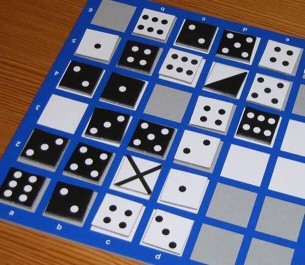 The game box include : a totally black 3d 9x9 board , 18 red dice, 18 black dice and a manual.The dice have the French card symbols on their sides (hearts , diamonds , clubs and spades) and are called knights. If the symbol is surrounded by a square it is called "prince". The game is similar to chess in general concepts. To win you have to "catch the king"...