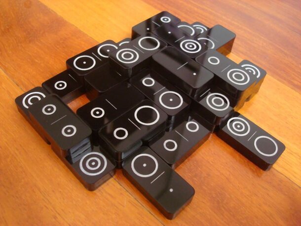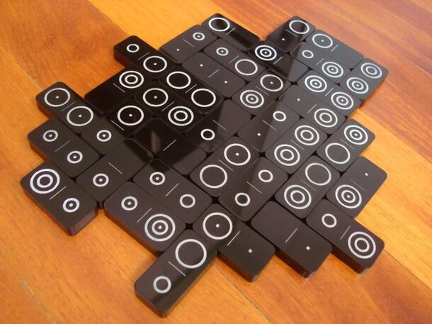 Dominomega is a game for exactly 3 players for the nestorgames' double-seven binary-coding dominoes set. It is the result of applying OMEGA scoring to this dominoes set. Each player has an allocated symbol (pip, small circle or large circle). Before the game starts, shuffle all tiles face down. Each player draws one tile (don't show it to the other...