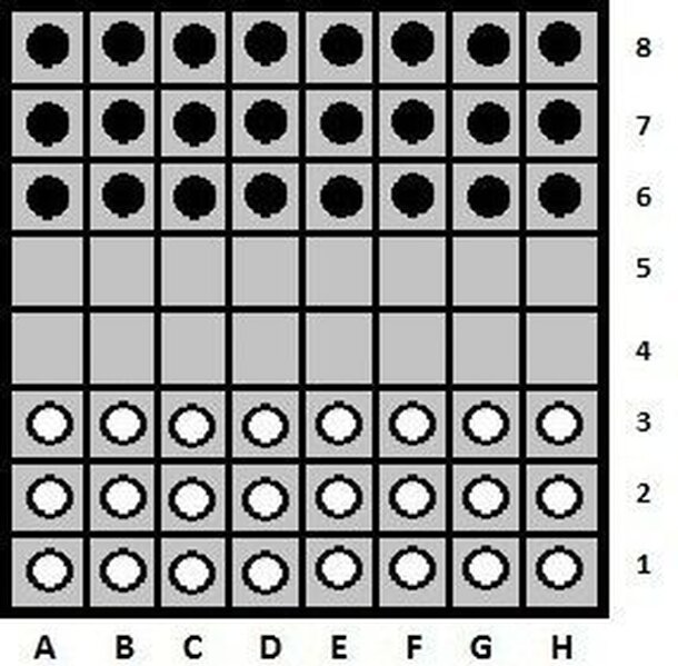 This is a game in the checkers/draughts family played on an 8x8 board, using 24 pieces aside. This game originated from asking two simple question regarding Anglo-America checkers: First, why is only half the spaces used? Second, what would happen if you used all 64 spaces of a checkerboard? End result is a game in the checkers/draughts family which tries...