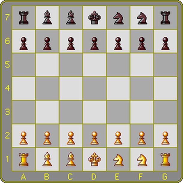 Dragonfly is a Chess variant played on a 7x7 board using most of the pieces of orthodox Chess, but not a Queen. The setup position puts the king in the center of the first row, with the Bishops left and the Knights to the right. Pawns have no initial double move, all other pieces move as in Chess. Castling is allowed, too. In practice, two sets of pieces...