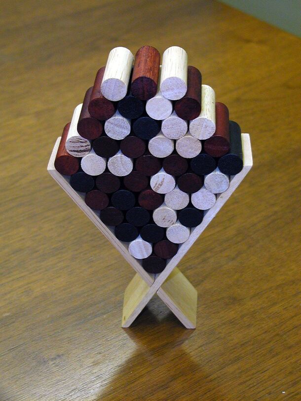 A 3-D strategic games with rhombic dodecahedrons to build a pyramid. Each piece piece has 6 white sides and six black sides. The contents are 30 plastic pieces, 2 playing grounds (triangular and square), and instructions. The main game (Cuckoo) is to place your piece at the top of the pyramid. You can prevent your opponent from reaching that goal through...