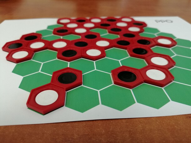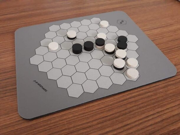 In Dualities two players (Even and Odd) compete to get the highest score by claiming certain lines on a hexagonal board with five hexes per side. The game commences with the empty board and players alternate turns placing one domino-style tile (formed by two hexagons of two different colours, black and white) on a free space of 2 adjacent hexes of the...