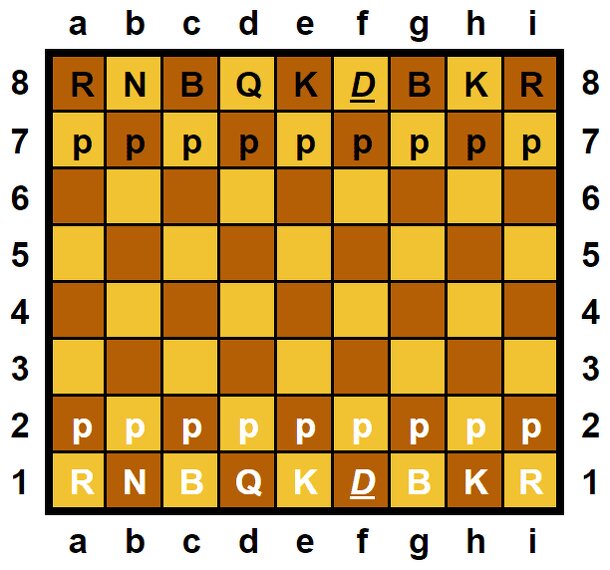 A chess variant that provides a larger board (8x9) and adds another piece to the standard chess set: The Duke. The Duke can move 1, 2 or 3 spaces in any direction but is unable to capture in any adjacent space but can capture in the subsequent 2 or 3 spaces beyond that. The Duke may also jump over pieces to bypass them. The Duke starts at the King's side...