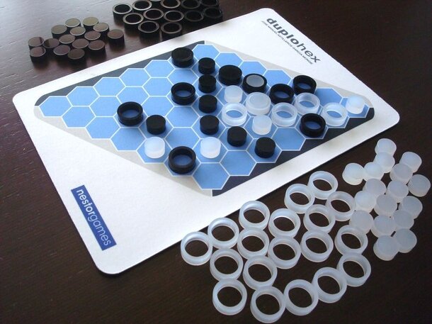 DuploHex is a connection game, related to Hex, that includes disc and rings. In order to play DuploHex you need a 7×7 Hex board, 24 black and 24 white rings, and 24 black and 24 white discs. White starts by placing one disc or ring on any cell of the board. Then, each player in turn must perform two actions: 1. add one of her discs to an empty cell or move...