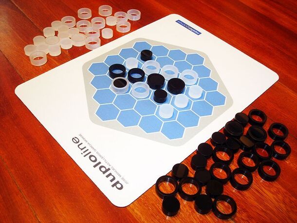 DuploLine is 4-in-a-row game that includes two different types of pieces (discs and rings). The goal for each player is to make a line of either four (or more) discs or rings of their own color. DuploLine is a very tactical game derived from the designer’s more strategic DuploHex. Although both games use the same types of pieces and similar rules, the...