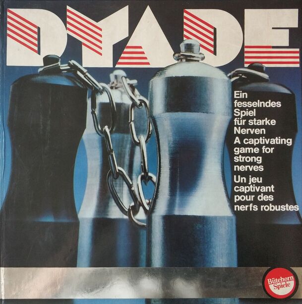 "Dyade: the captivating game for strategists One 'dyad' (Greek: a pair of units) consists of 2 figures connected by a chain." Dyade is a draughts/checkers variant with a twist - pieces are made up two metal posts joined by a chain link, and opposing pieces stand on squares of opposite colors. A move consists of moving one post of any piece, only as far as...