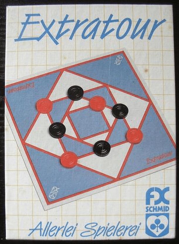 Objective: collect most winning points after a series of 3 games - acting/moving by turn - Both players place 7 coloured pieces alternately on a board - which shows 5 squares (16 triangles) - and move them; player who forms a square scores 3 points (new game), 3 in a row 1 point (and may remove 1 opponent's piece from the board) until one player possesses...