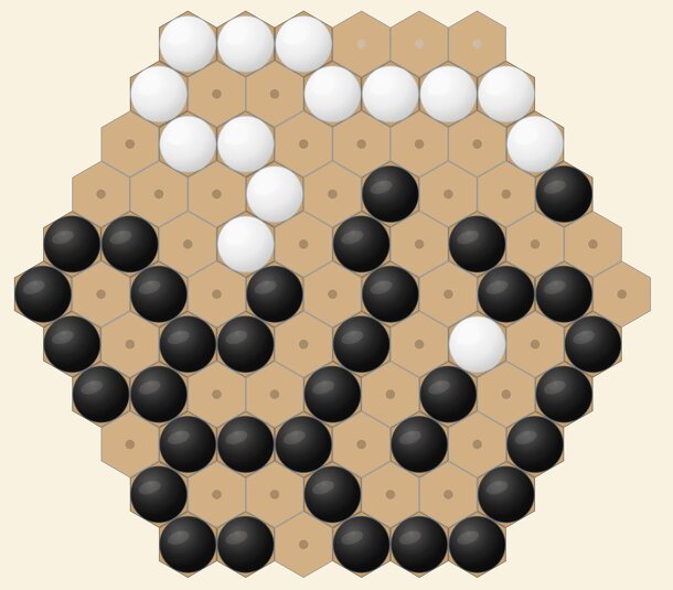 Exile is played on a hexagonal grid of hexagons (size 6 recommended) by placing and removing Go stones. White starts. Each turn, place one stone on an empty space, subject to the placement restrictions, and remove stones subject to the capturing rules. PLACEMENT RESTRICTIONS: Stones may not be placed in “three-mutually-adjacent-stones” triangle formations....